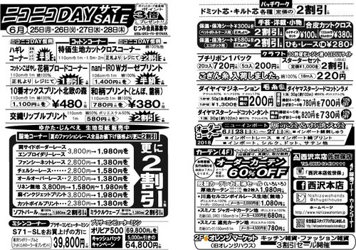 みなさまこんにちは(●^o^●) 6月25日(月)から28日(木)まで「ニコニコデー」セールがはじまります(*^^)v 是非この機会にご来店くださいませ(*^_^*) ☆お得な情報発信中☆ ポチポチっと押してくださると幸いです(*^_^*)