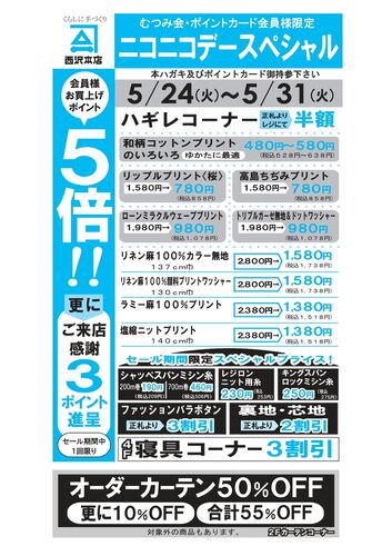 みなさまこんにちは あさって24日(火)よりむつみ会・ポイントカード会員様限定「ニコニコデースペシャル」がはじまります 今回のニコニコデースペシャルはお買い上げポイントが5倍❗️ ハギレコーナー半額✨ そして、限定スペシャルプライスセールなどなど…