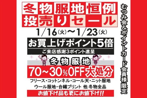 あさって1月16日(火)より、 冬物服地恒例投売りセールを開催いたします 1月16日(火)〜23日(火)の期間中お買い上げポイント5倍❗️ LINEお友だちにはご来店感謝3ポイントプレゼント✨ (レジにてお友だち登録画面(またはトーク画面)ご提示くだ…